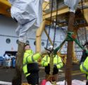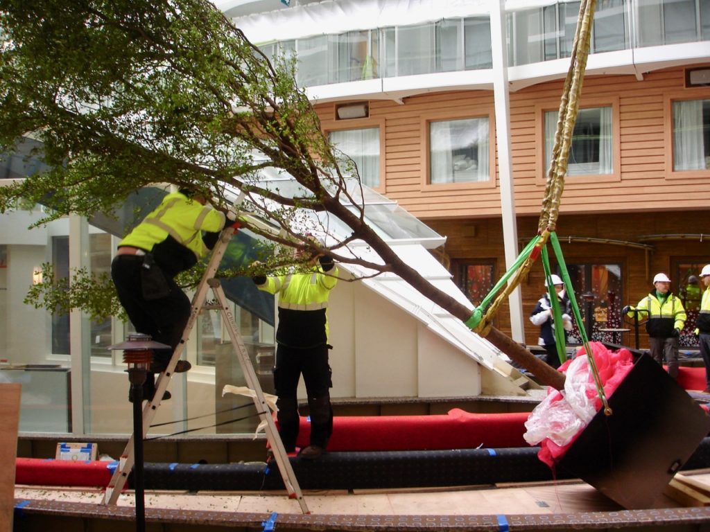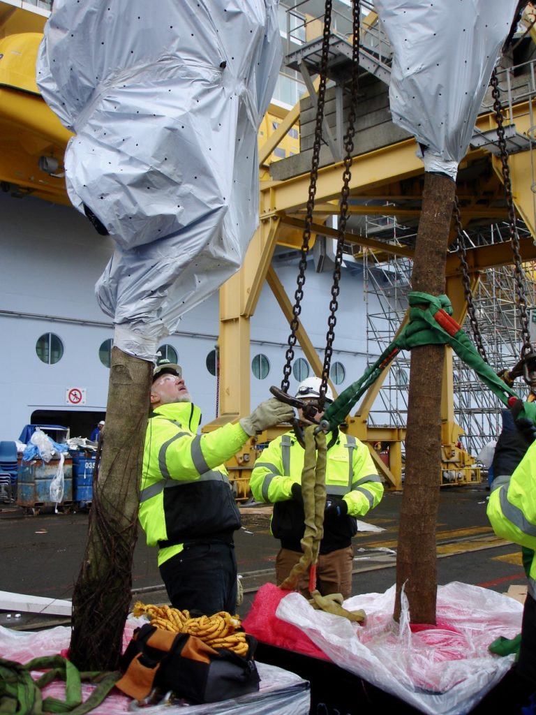 Voici quelques photos de la plantation des nombreux arbres et plantes sur le navire de croisière dans un port français et le résultat final. Le bateau de croisière navigue maintenant. Les grands arbres ont dû être hissés à bord avec une grue spéciale. Toutes les plantes et tous les arbres ont été pré-plantés dans des conteneurs en acier numérotés spéciaux basés sur un système semi-hydro.